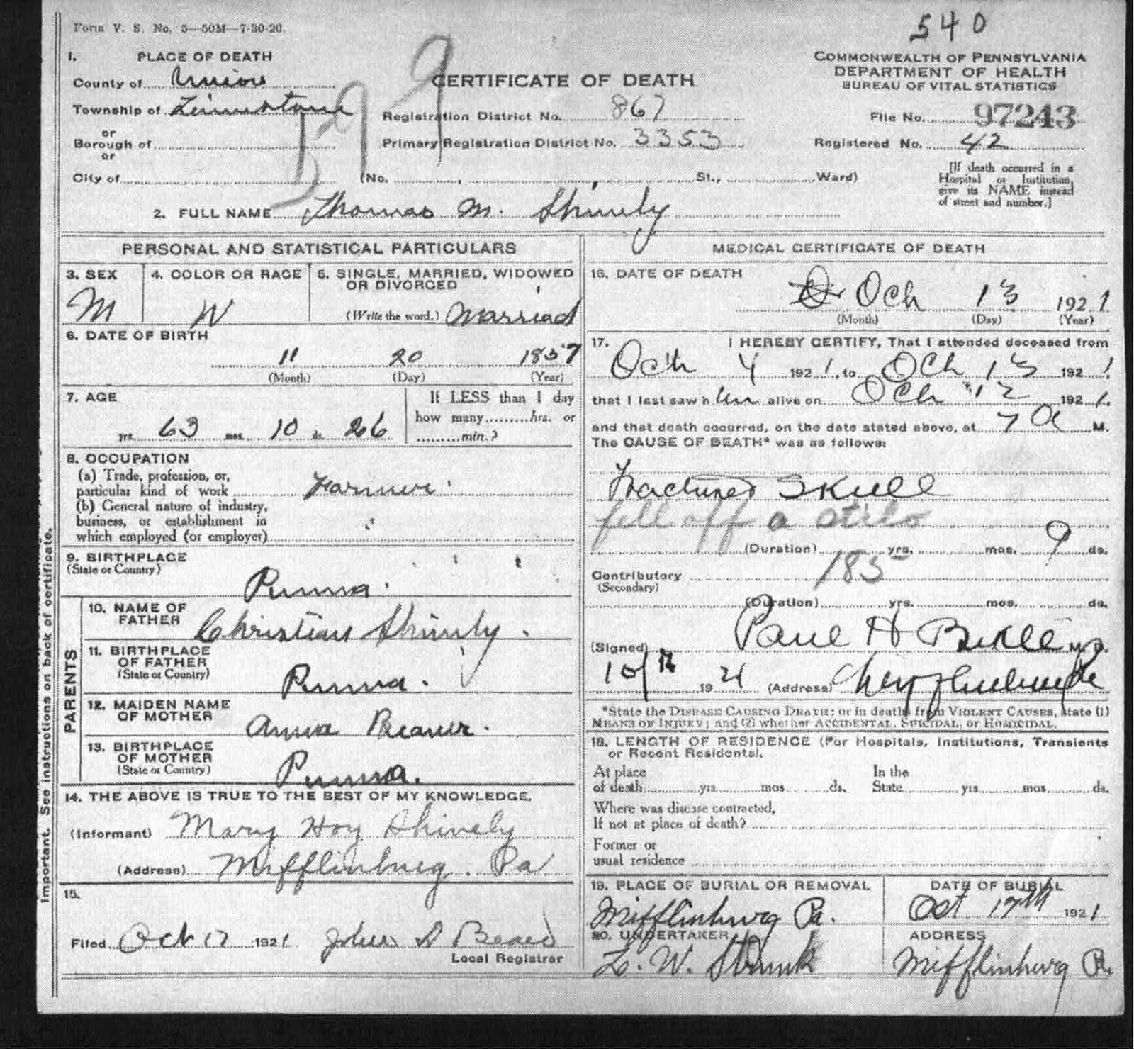 Milton Shively was born 21-Jul-1896 in Huntington County, IN and died 15-Nov-1959 in Huntington County, IN. Milton Shively was the son of James Albert Shively (born 30-Aug-1868 in Allen County died 20-Nov-1945 in Huntington County, IN) and Tabitha Spencer (born 29-Jun-1878 in Kosciusko County, IN died 8-Apr-1947 in Huntington County, IN). James Albert Shively was the son of Samuel Shively (born Aug-1840 died ca. 1903 in Huntington County, IN) and Esther Alvina Whittington (born 27-Mar-1841 in Wayne County, IN died 16-Dec-1913 in Huntington County, IN).